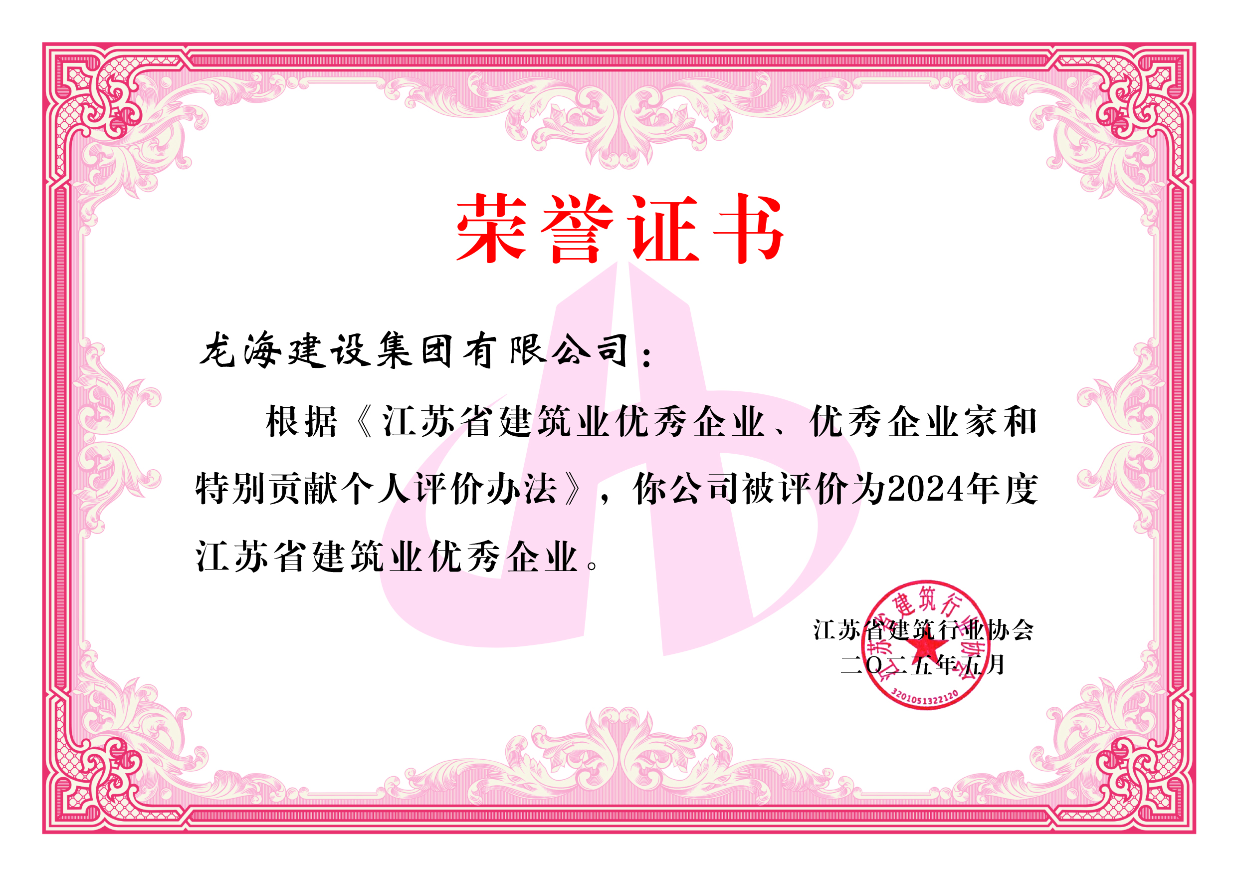 近日,在江蘇省建筑行業(yè)協(xié)會(huì)舉辦的年度評(píng)選中,公司憑借卓越的綜合實(shí)力、杰出的工程業(yè)績(jī)以及良好的企業(yè)信譽(yù),成功榮獲 “2024年度江蘇省建筑業(yè)優(yōu)秀企業(yè)” 稱號(hào)。